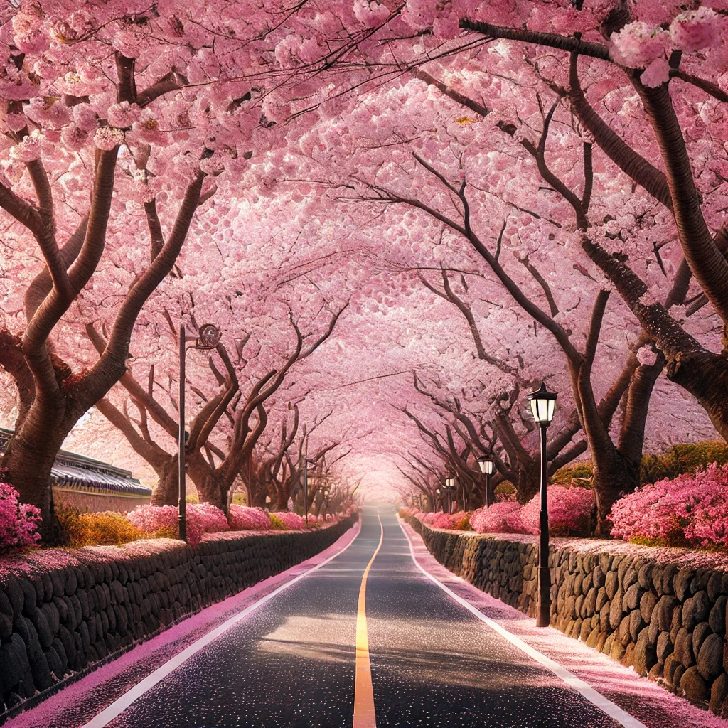 제주는 국내에서 벚꽃이 가장 빨리 피는 곳으로, 특히 전농로 벚꽃길은 돌담길과 어우러져 이국적인 분위기를 느낄 수 있습니다.